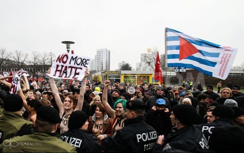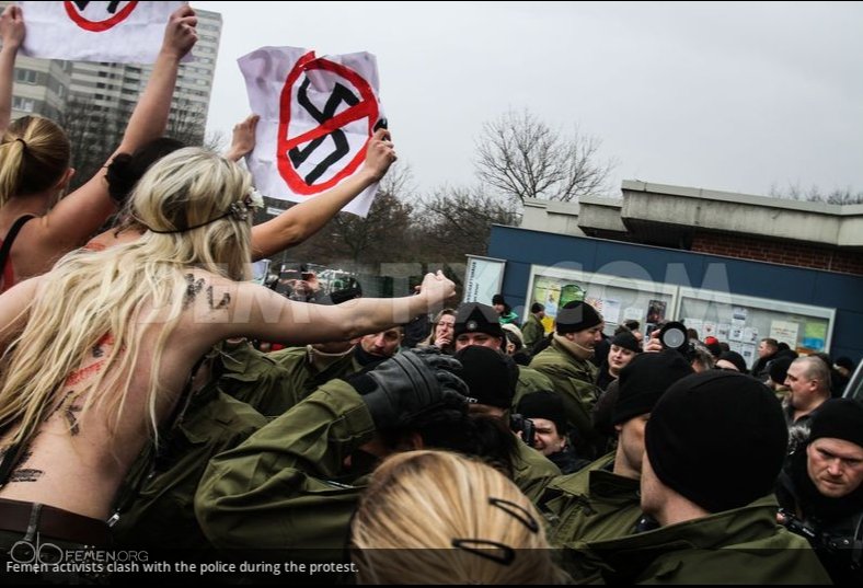 "FEMEN-Germany поділяє принципи німецького антифашистського руху і вимагає повної заборони будь-яких неофашистських політичних і культурних об'єднань. FEMEN заявляє, що такі історичні інститути як фашизм, церква, сталінізм та інші репресивні машини не мають права на актуальне існування і заслуговують скинення і забуття", - йдеться у повідомленні FEMEN.