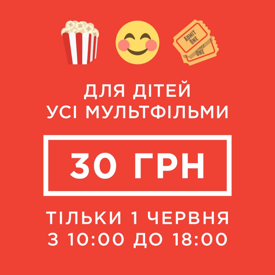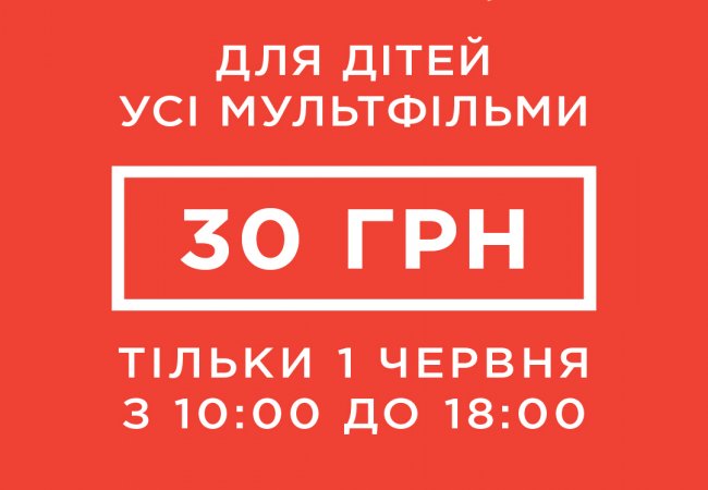 Тільки 1-го червня з 10:00 до 18:00 усі мульфільми для дітей по 30 грн!