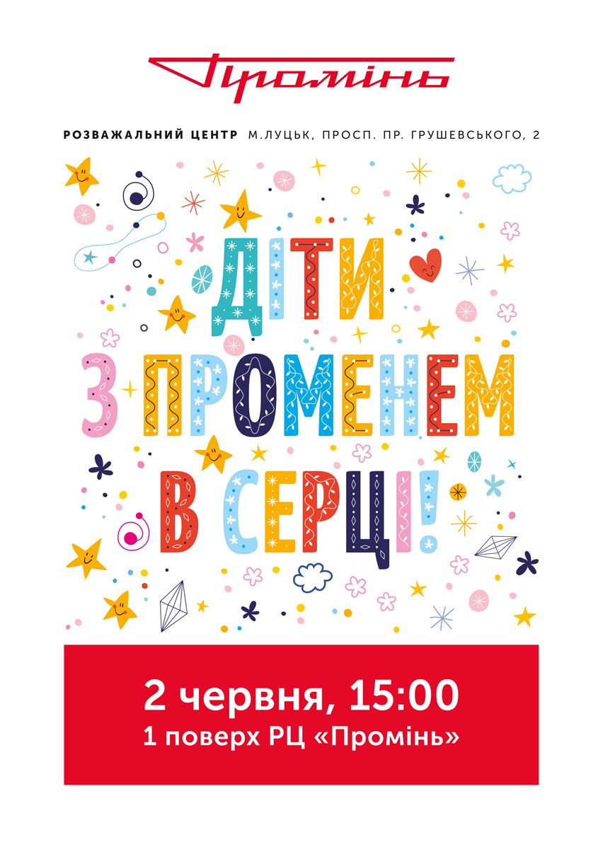 А вже 2 червня в холі РЦ «Промінь» відбудеться розважальна програма для дітей «Діти з променем в серці». Художні майстер-класи, конкурси та розіграші, фейс-арт, лотерея від Смугастого з подарунками, багато веселощів та позитивних емоцій!