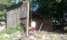 Луцькі муніципали продовжують роботи з демонтажу дерев’яної конструкції, що розташована на вулиці Підгаєцькій, 9а.