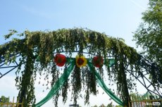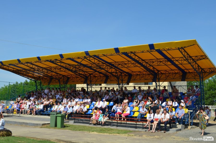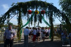 Вхід на стадіон, як годиться, прикрасили як справжню весільну браму - його обрамили гіллям молодої берези та яскравими квітами. На вході усім гостям чіпляли букетики із зелені, а музики вигравали запальних пісень.