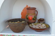 Цікаво, що на реквізиті тут аж ніяк не економили. На сцену винесли справжню піч, поруч на старих скринях порозкладали вишивані пухові подушки, а на столі стояли духмяна наливка і ледь каламутна самогонка та миски з домашніми ковбасами.