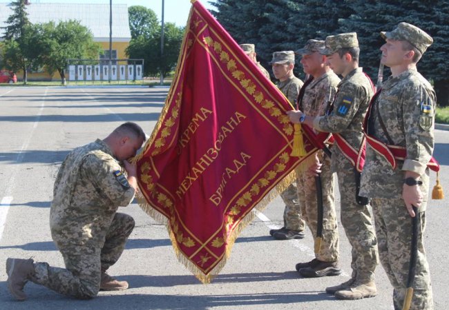 За традицією полковник Олександр Жакун урочисто передав Бойовий Прапор новому командиру бригади полковнику Сергію Войченку.