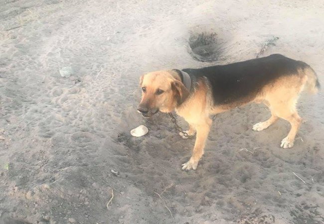 "Усіх нас змусила зупинитись картина, яку ми побачили: на полі, де не було жодного укриття, рив собі нору пес, виснажений майже 30-градусною спекою, зморений голодом, спрагою і прямим сонячним промінням, з важким цепом та подвійним ошийником, товщиною до 10 сантиметрів", - розповідає місцева мешканка.