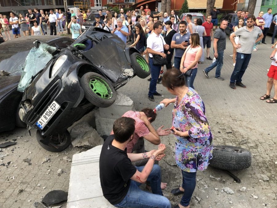 У місті Ірпінь Київської області BMW протаранив зупинку, злетів з дороги на парковку та пошкодив ще три автомобілі. Водій джипа, на диво, вижив.