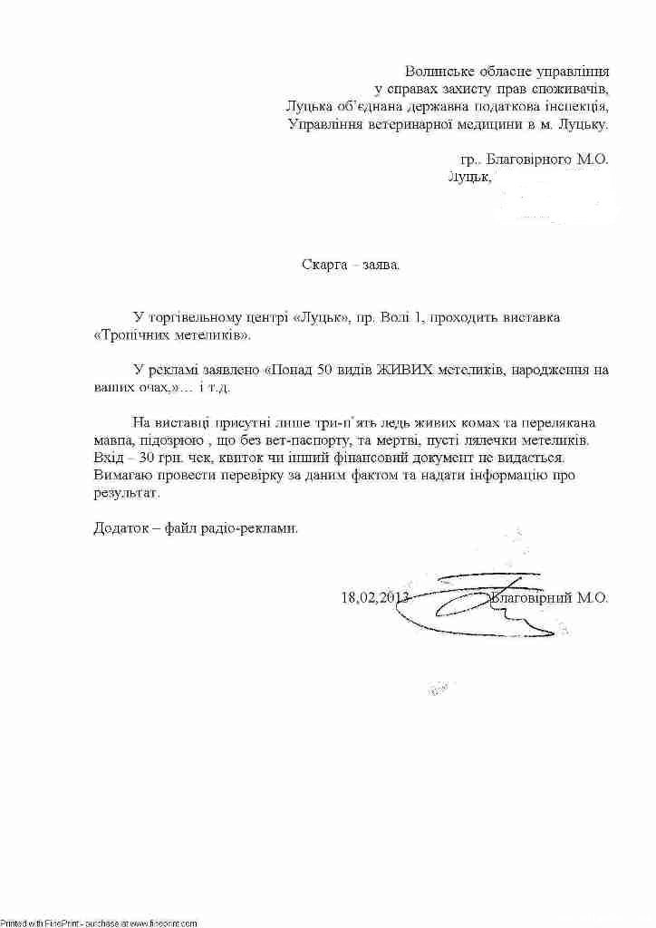 «У рекламі заявлено: «Понад 50 видів живих метеликів, народження на ваших очах». На виставці присутні лише три-п`ять ледь живих комах та перелякана мавпа. Підозрюю, що без вет-паспорту, та мертві, пусті лялечки метеликів. Вхід 30 гривень. Чек, квиток чи інший фінансовий документ не видається. Вимагаю провести перевірку за даним фактом та надати інформацію про результат», - скаржиться Благовірний.