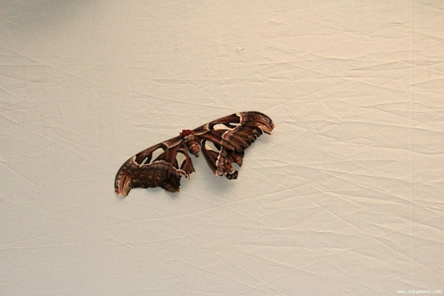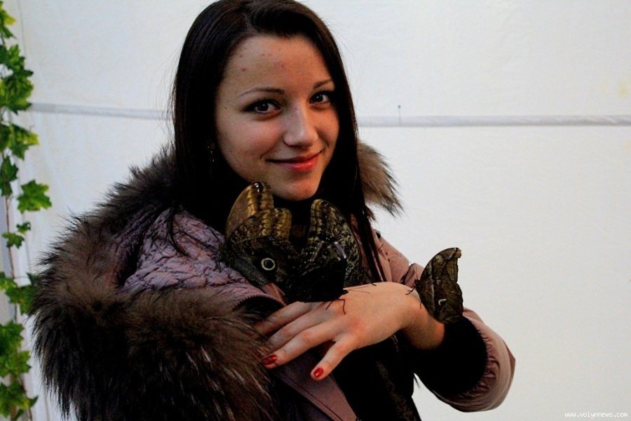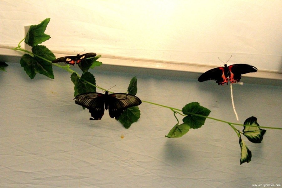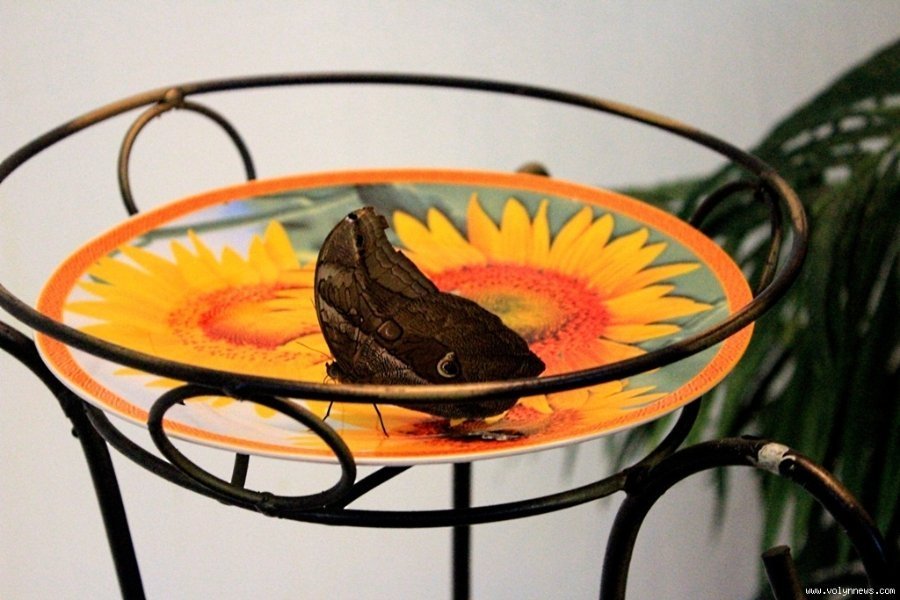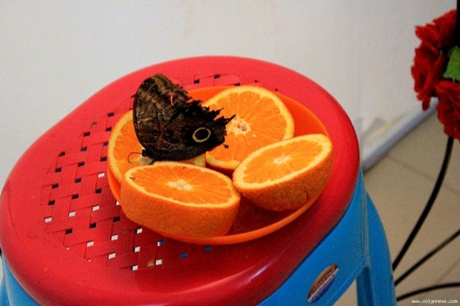 У невеличкому залі, де відбувається виставка, доволі тепло. «Для комфортного життя комашок створений спеціальний мікроклімат», - пояснює дівчина. На тарілці з апельсинами сидять два метелики, під стелею зо два десятки. У деяких комашок пошкоджені крильця. Адміністратор пояснила, що люди часом дуже необережно поводяться з метеликами, не враховуючи, що навіть найменший дотик може їх травмувати.