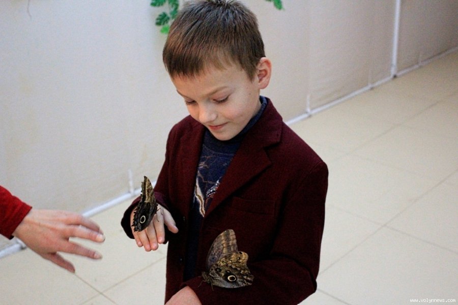 Метелики зовсім ручні і не бояться людей. На руках у хлопчика-школяра сидить три комахи. Видно, що дитина дуже задоволена тим, що відбувається.