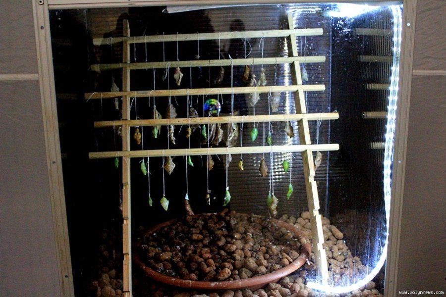 У скляному акваріумі - лялечки, з яких народжуються метелики. Однак гарантувати, що це відбудеться у час вашого візиту, не можна. Під час перебування кореспондентів «ВН» одна з лялечок мала розкритися з хвилини на хвилину. «Після народження метелик дві-три години обсихає і потім його випускають. Як правило, метелик живе кілька днів, тому експозиція постійно оновлюється»,- повідомила адміністратор.