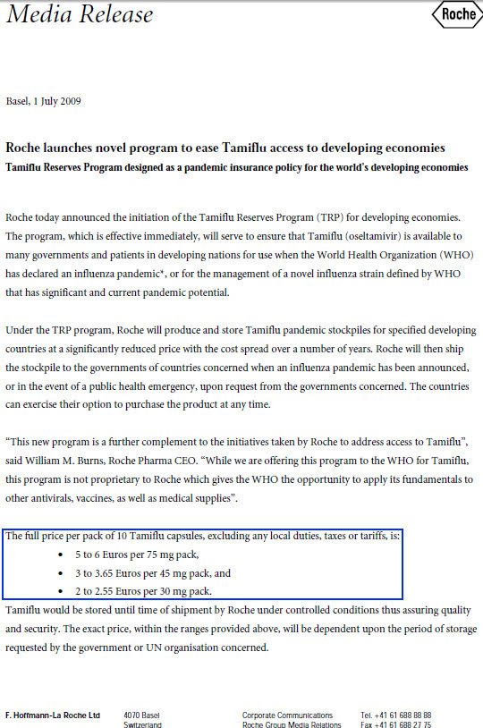 Так, вартість закупленого препарату становила 251 гривню або 22 євро за курсом 2009 року за упаковку, хоча виробник пропонував Уряду купити ліки ще до епідемії по ціні 5-6 євро.