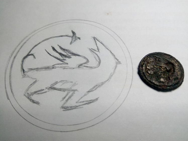 На звороті ледве помітні залишки кільця. Тобто, навірогідніше, це був перстень-печатка. Доказом цьому є також те, що зображення є заглибленим і залишає відбиток на м’яких матеріалах.