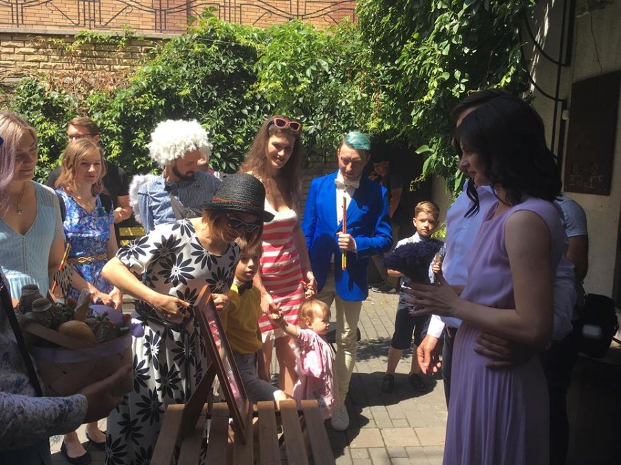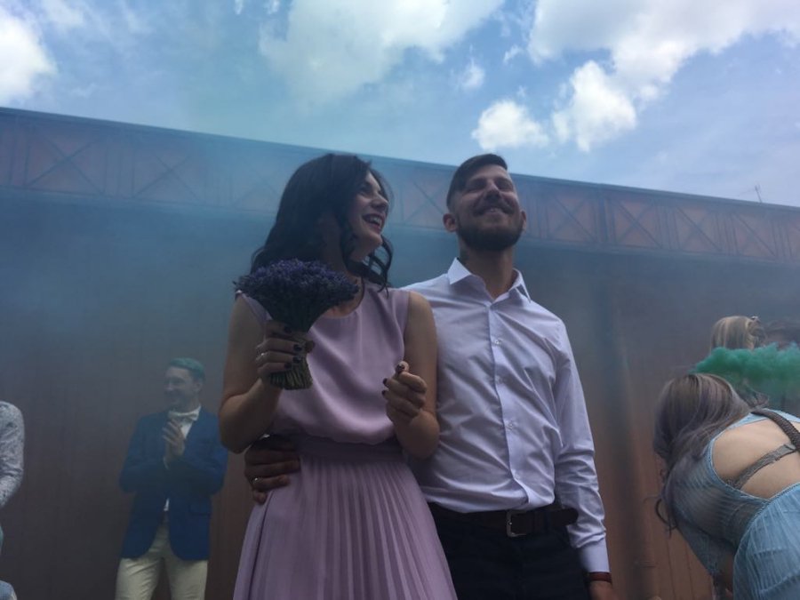 Перед входом до приміщення актор театру «Гармидер», де грає Валянік, влаштували для пари міні-театралізоване дійство з кольоровими димовими шашками, янголами та пелюстками троянд.