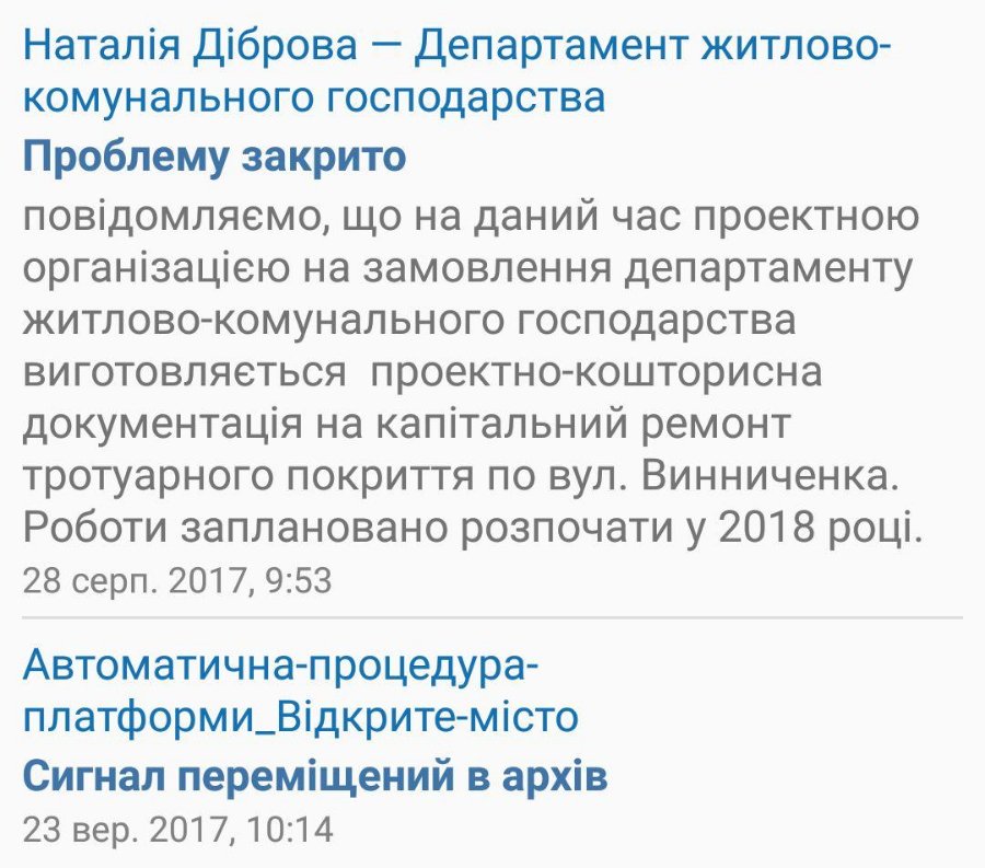 "Майже рік тому подавав заявку про аварійний ремонт тротуару на вулиці Винниченка(відсутність покриття, багнюка, пошкодженна бруківка). Департамент міської ради запевнив що проектування вже ведеться, а роботи будуть проведені в 2018 році. Але ситуація і надалі така ж плачевна, як і рік тому... Може все ж таки чиновники звернуть увагу на одну з центральних вулиць міста? Чи ще просто не час виборів?" - йдеться у повідомленні.
