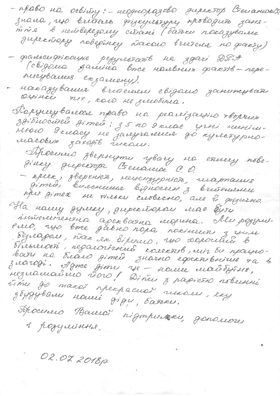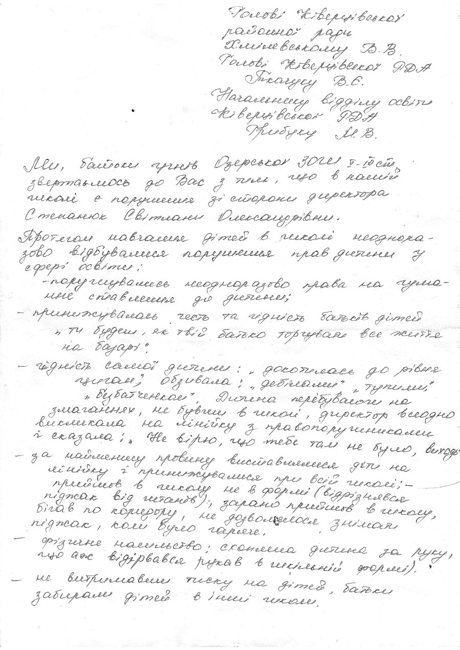 Більше того, 2 липня 42 батьків учнів школи села Озеро підписали звернення голові Ківерцівської районної ради Василю Хмілевському, голові Ківерцівської РДА Валерію Ткачуку та начальнику відділу освіти Ківерцівської РДА Миколі Грибуку. У ньому батьки розповідають про моральні і навіть фізичні знущання над їхніми дітьми з боку директора школи Світлани Степанюк. Для прикладу, про те, що остання принижує честь та гідність дітей і батьків, говорячи такі слова, як "будеш як батько ціле життя на базарі торгувати", "ти докотився до рівня циган", "безбатчеко", "дебіл", "тупий" тощо. Окрім того, батьки повідомляють і про фізичне насильство. Так, на їхнє переконання, одного з учнів директор смикнула за руку настільки сильно, що аж відірвався рукав у шкільній формі. Батьки, які підписали звернення, повідомили також про те, що Степанюк з'ясовувала стосунки із вчителями (не лише словесно, але й фізично) на очах у дітей.