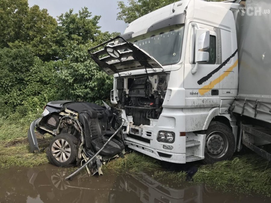 Під час потужної зливи вантажівку, що прямувала у столицю, занесло і викинуло на зустрічну, де їхав легковий Volkswagen.