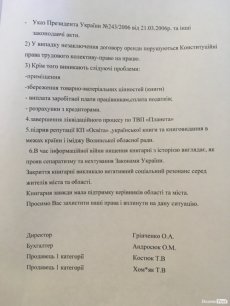 "Підстав на це немає. Єдине - в когось напевне є бізнес-інтереси",- - припускає посадовець. Про перспективу продажу приміщення у книгарні дізналися із преси. Натомість працівникам ніхто не озвучував жодних зауваг чи претензій. Ба більше - за майже 60-річну історію існування книгарні тут попагували українську книгу, а комунальне підприємтсво входить до 10 кращих книготоргових підприємств країни.