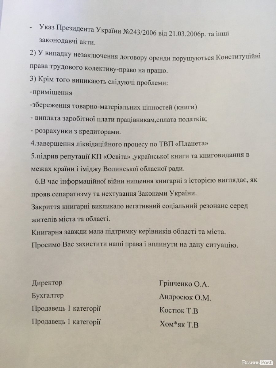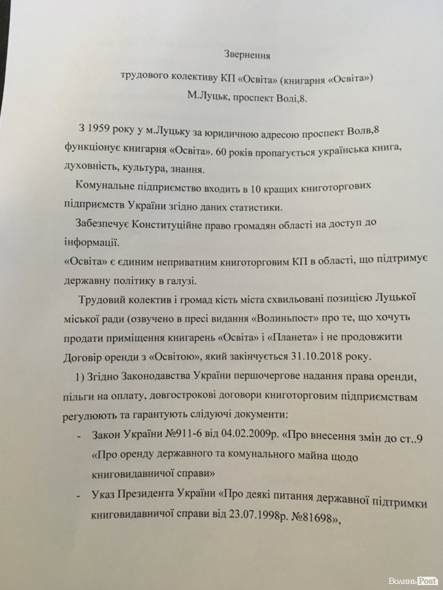 У Луцьку представники трудового колективу книгарні "Освіта", яка розміщена на проспекті Волі, 8, підготували звернення до голови Волиньради та ОДА, депутатів різних рівнів із проханням захистити їх права та не продавати приміщення книгарні.