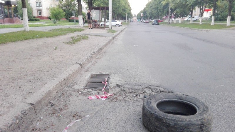"Одну з великих ям кілька днів тому "позначили" автомобільною шиною, яка так спокійно і спочиває там. Це аж ніяк не додає безпеки на дорозі на вулиці з досить інтенсивним рухом. Яму і шину щодня мусять об'їжджати як маршрутні таксі так і звичайні автомобілі", - йдеться у повідомленні.