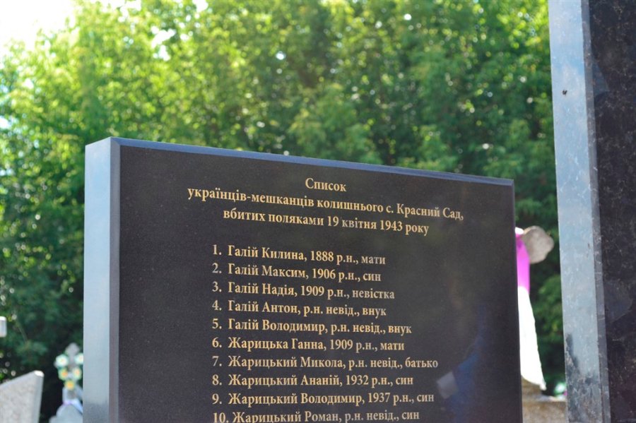 Трагедія трапилася 75 років тому, 19 квітня 1943 року, коли загони Армії Крайової та польських колоністів, заручившись підтримкою гітлерівських окупантів, розстріляли з автоматів усіх, кого знайшли. Зі 114 селян живими залишилося лише декілька людей. Жертвами побоїща стали 103 красносадівці, 104-м був гість одного з господарів села.