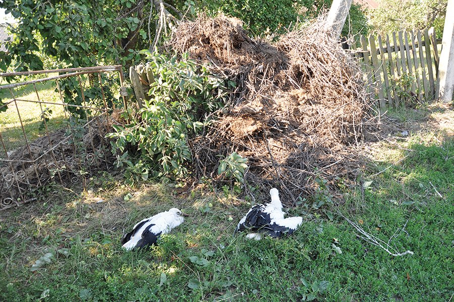 Як розповідають місцеві мешканці, двоє беззахисних пташенят лежали поблизу свого зруйнованого дому, ще один, добряче наляканий, стояв за десяток метрів. Дорослих лелек на місці не виявилося.