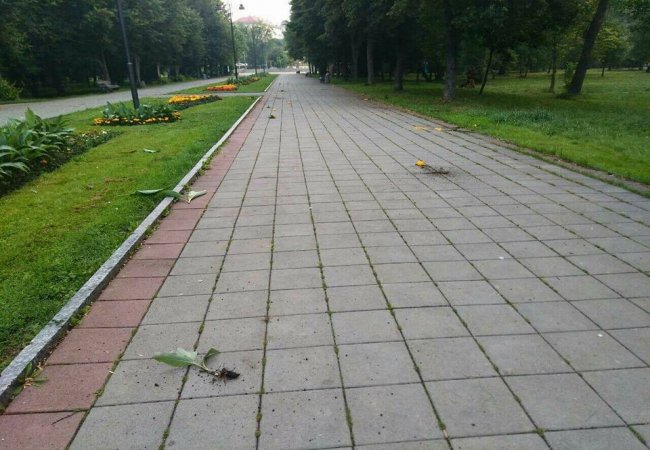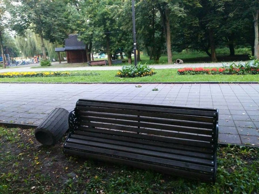 На центральній алеї та алеї ліхтарів невідомі перекинули усі лави та смітники. Окрім того, виривали квіти з клумб.