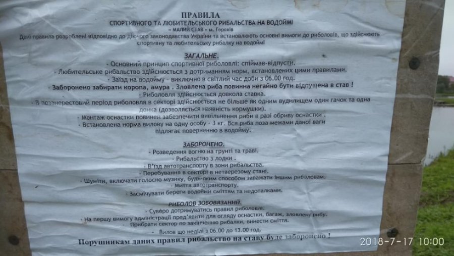 Згідно з правилами спортивної та любительської риболовлі на водоймі Малий став у Горохові заборонено розводити вогонь на ґрунті та траві, шуміти, засмічувати береги водойми сміттям і недопалками.