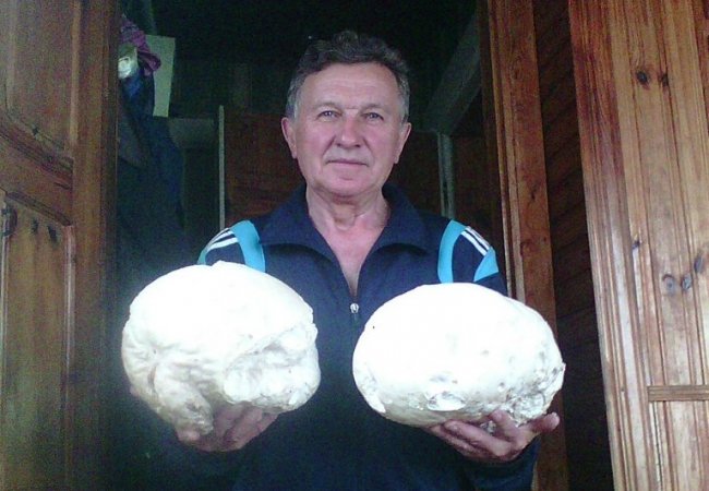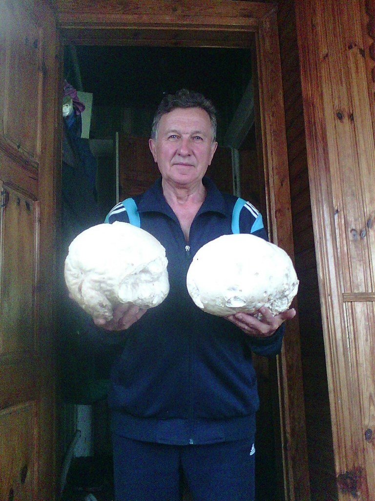 Колишній міський голова Любомля, грибник зі стажем Петро Мохнюк знайшов у садку два гігантські гриби-дощовики.