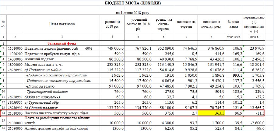 Покровський зауважив, що на сайті Луцької міської ради є розділ "Бюджет" (https://www.lutskrada.gov.ua/budget). Там же можна знайти документ про доходи за перше півріччя 2018 року. Станом на 1 липня у загальний фонд було сплачено 363,5 тис. гривень частини чистого прибутку комунальних підприємств, що становить 96,9% від запланованого (фото в додатку).
