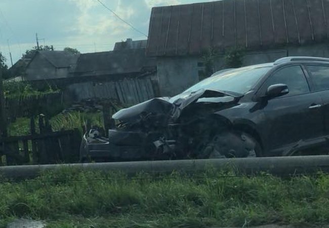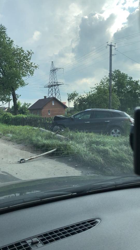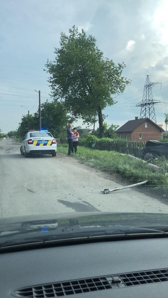 Чорна машина продаранила електроопору. В результаті аварії передня частина автівки повністю понівечена: погнутий капот, розбитий передній бампер, викручене колесо.