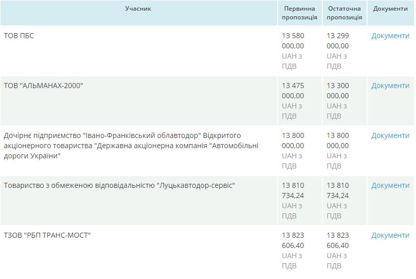 Участь у закупівлі взяли п'ять претендентів: ТзОВ "РБП ТРАНС-МОСТ", ТзОВ "Луцькавтодор-сервіс", дочірнє підприємство "Івано-Франківський облавтодор" Відкритого акціонерного товариства "Державна акціонерна компанія "Автомобільні дороги України", ТОВ "АЛЬМАНАХ-2000" та ТОВ "ПБС".