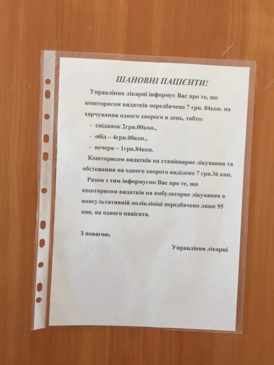 За словами посадовця, на харчування одного хворого у лікарні на день виділяють 7 гривень 84 копійки. Цю суму треба розділити на 3-разове харчування, а для хворих з гастроентерології взагалі - на 4 прийоми їжі.