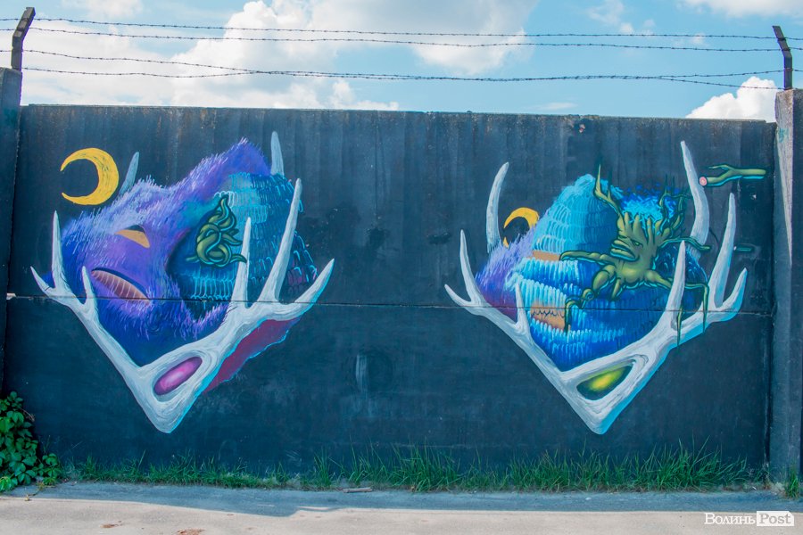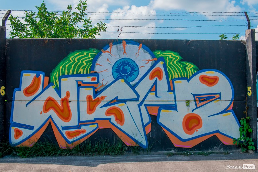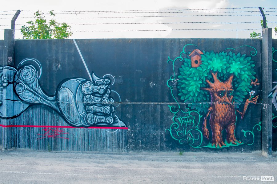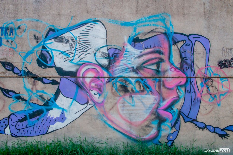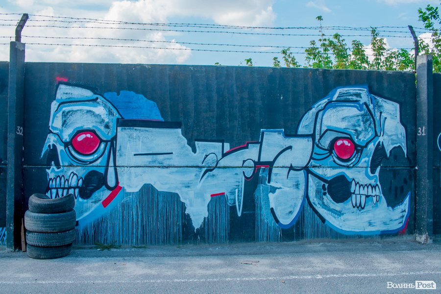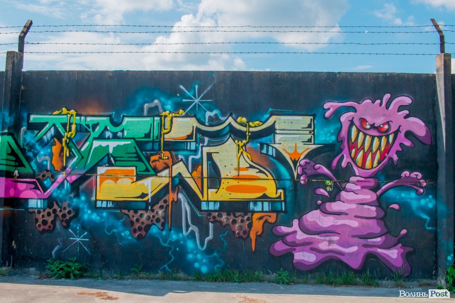 На вулиці Єршова у Луцьку вуличні художники розмалювали величезну стіну десятками графіті.