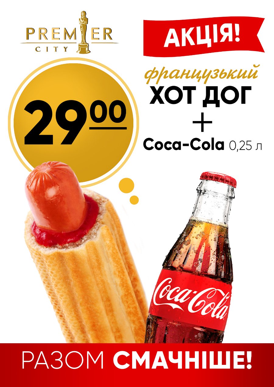 А також маємо для Вас вигідну пропозицію – хот-дог + напій «Coca-cola» за ціною 29 гривень!