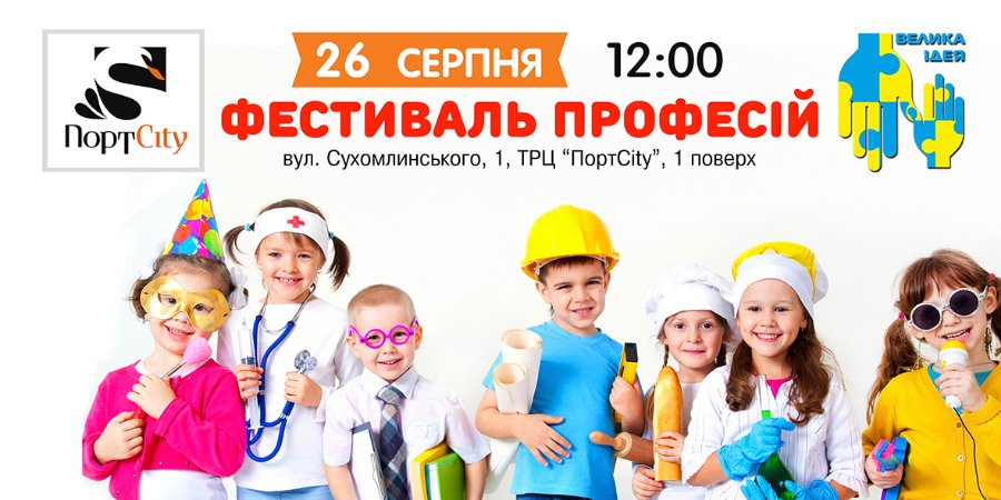 26 серпня у ТРЦ «ПортCity» відбудеться масштабний «Фестиваль професій». Захід організований спільно з ГО «Велика ідея» в рамках проекту «100 ідей для дітей»! Долучитись до фестивалю зможуть усі бажаючі діти віком від 3 до 18 років.