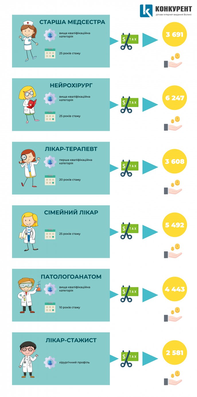 Скільки ж зарплати "чистими" в середньому отримують окремі медпрацівники, дивіться в інфографіці.