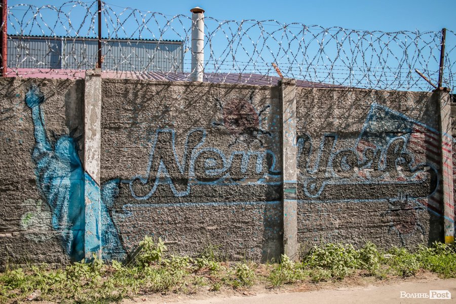 Огорожа заводу «Мотор» ззаду прикрашена вже полинялим графіті, яке чи то заманює в гості, чи просто констатує назву міста - Нью-Йорк, поряд із якою протягнула руку з факелом вгору намальована Статуя Свободи. Аби підтримати традицію чи щоб не відставати від модних тенденцій, хтось яскраво розфарбував і гараж навпроти.