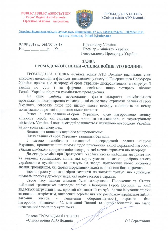 Громадська спілка "Спілка воїнів АТО Волині" висловила у листі до Президента і прем'єр-міністра своє глибоке занепокоєння фактами, наведеними у виступі генерального прокурора, про те, що нагорода "Герой України" дискредетована та потребує заміни по суті і за формою, оскільки щодо чотирьох діючих Героїв України відкрито кримінальне провадження, - про це пише ipress.ua.