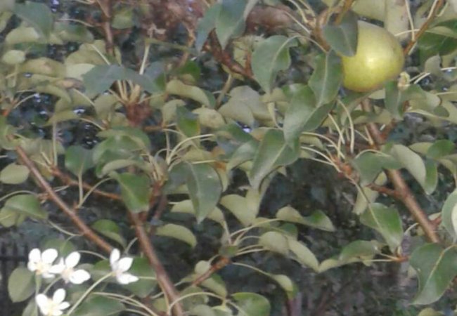 На світлині поруч із дозрілим плодом красується білосніжний цвіт.