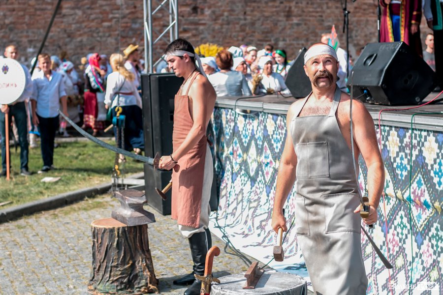 Окрім звуків народних пусень, у замку чути ще й як перегукуються молоти ковалів, які кують гострі шаблі, списи, мечі. А з обох боків сцени "жнуть" снопи женці та косарі.
