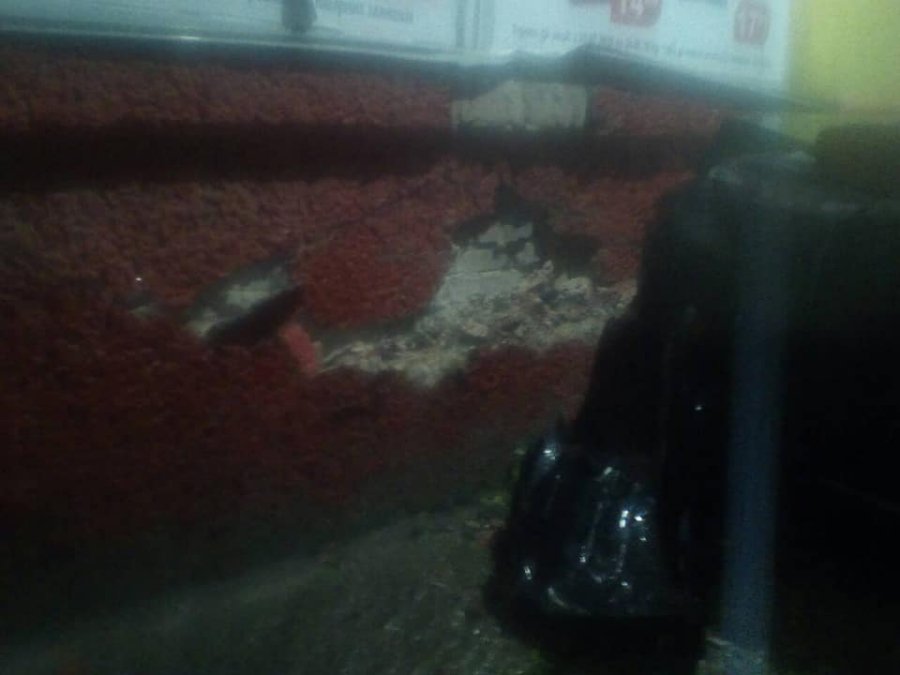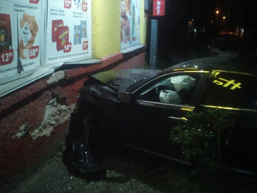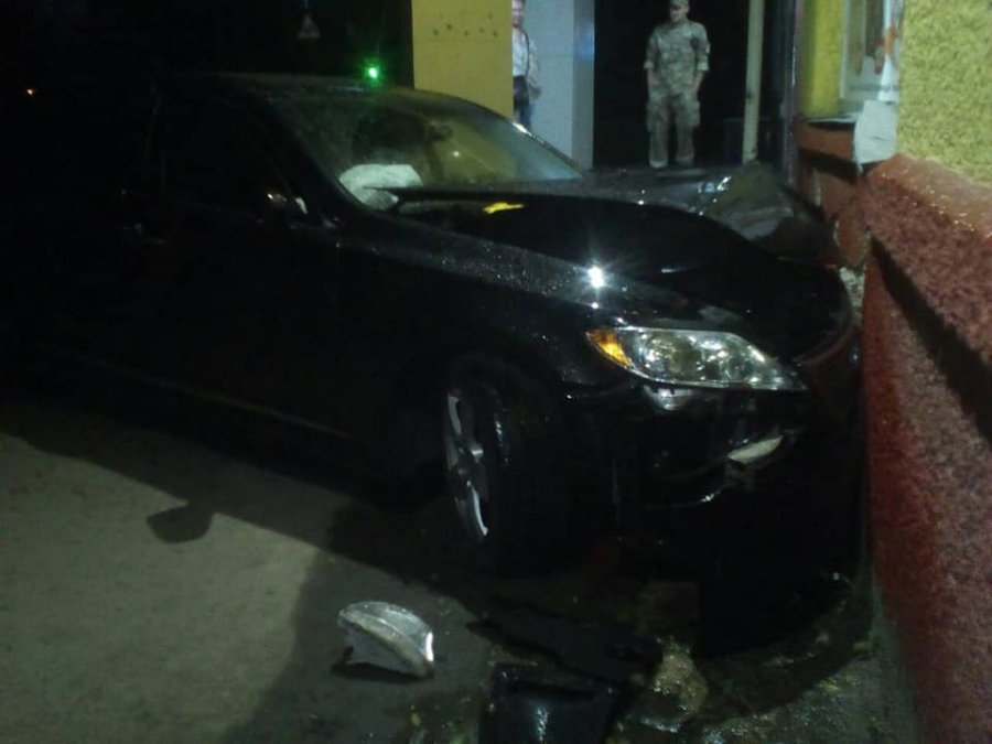 "Посеред ночі 12-08-2018 "Лексус" на київських бляхах розігнався у стіну будівлі по пр. Перемоги, 14. Мо' до нас на штаб хотіли заїхати? Завалив частину стіни мінімаркету "Наш край", що аж вітрини у магазині попадали. Укробляхарі кинули авто на місці ДТП напризволяще та накивали п'ятами", - йдеться у дописі.