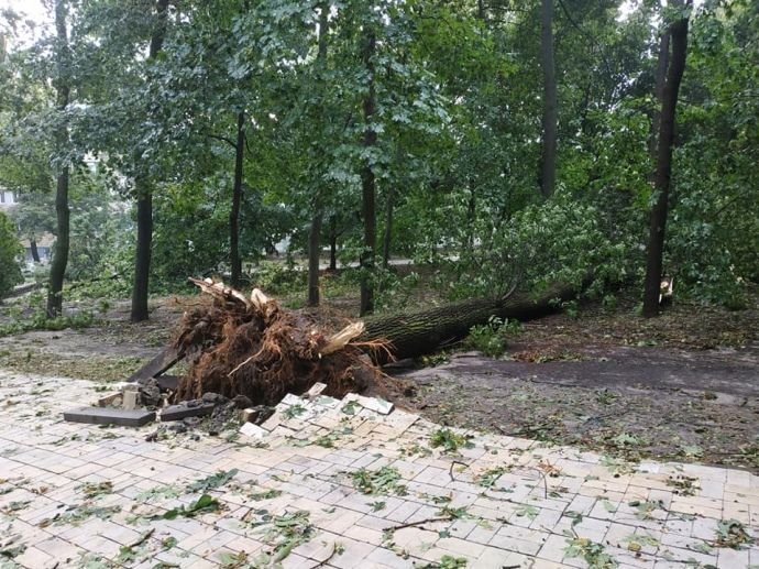 Потужний вітер поперевертав літні тераси кафе. Попадало чимало дерев, особливо в парку біля Верховної Ради та Кабміну.