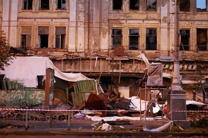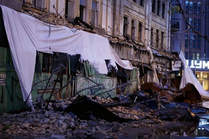 На Хрещатику злива частково доруйнула старий гастроном, який стоїть руїною вже кілька років.