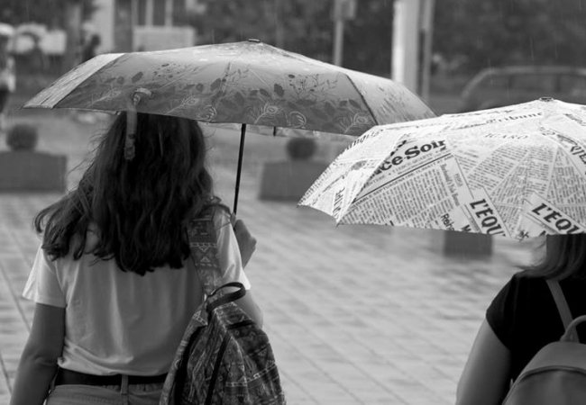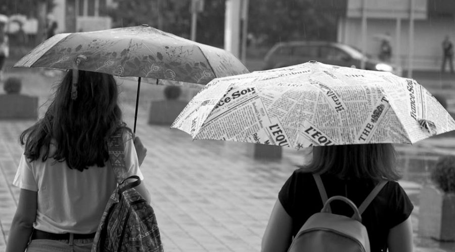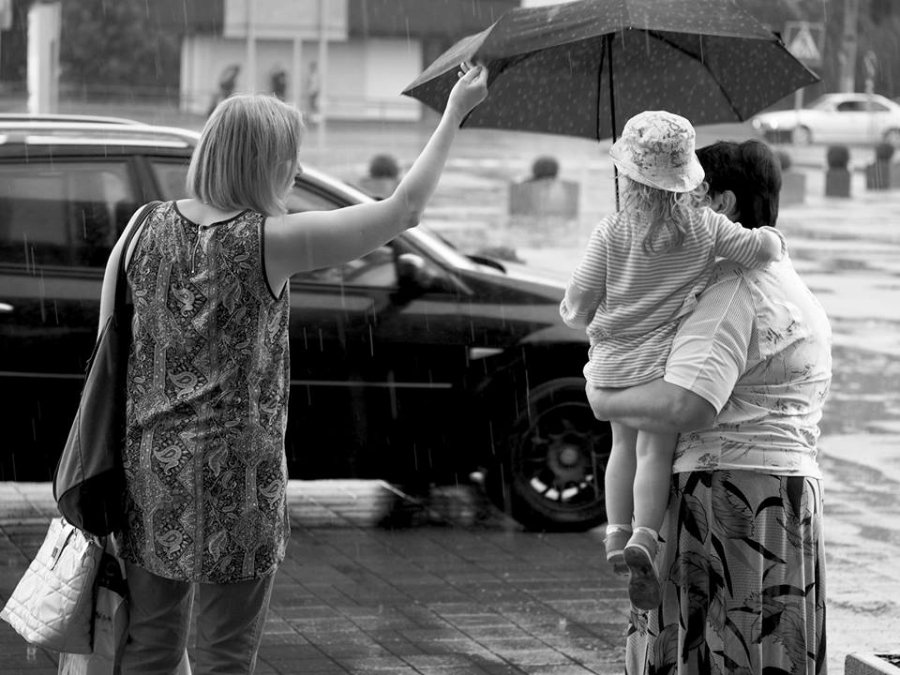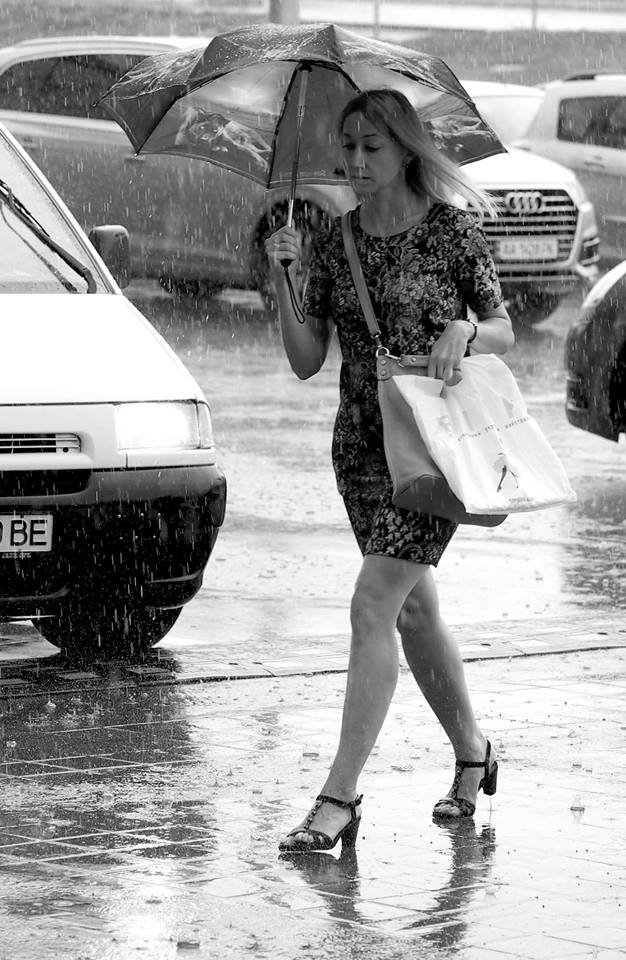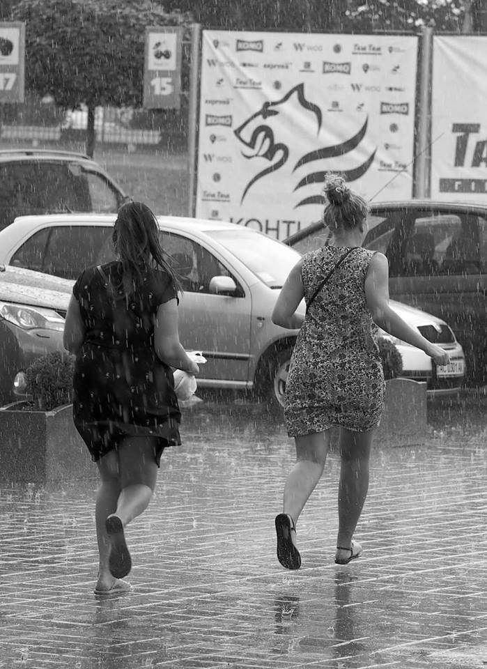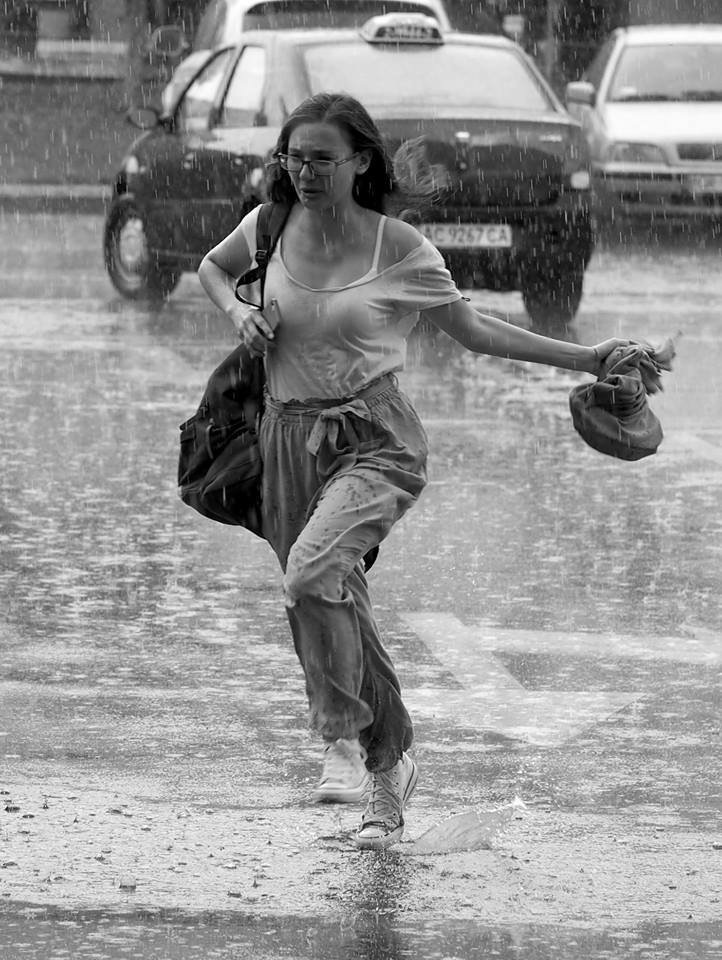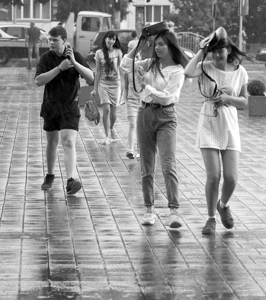 На фото зафіксовані люди, які тікають від рясного дощу, або ж навпаки - вже змирилися із тим, що доведеться мокнути. Окрім того, фотограф засвітлинив дівчат, які ховаються від зливи під парасольками.