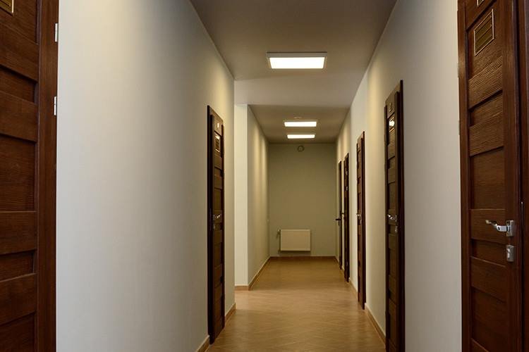 Перший поверх займають технічні приміщення, малий зал та службові кабінети.