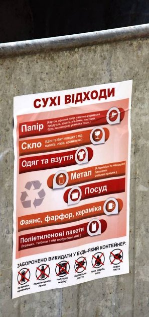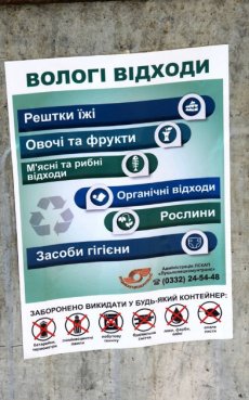 На кожному контейнері вказана інформація про те, для яких саме відходів він призначений, а саме – для сухої, вологої фракції та ПЕТ-пляшок.