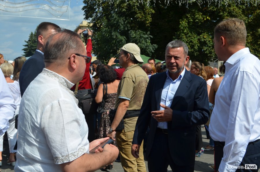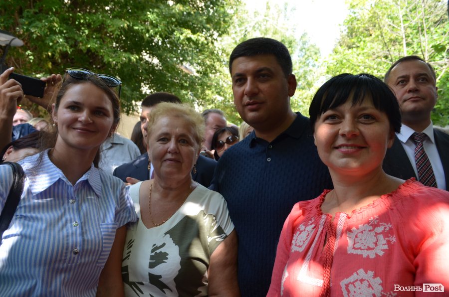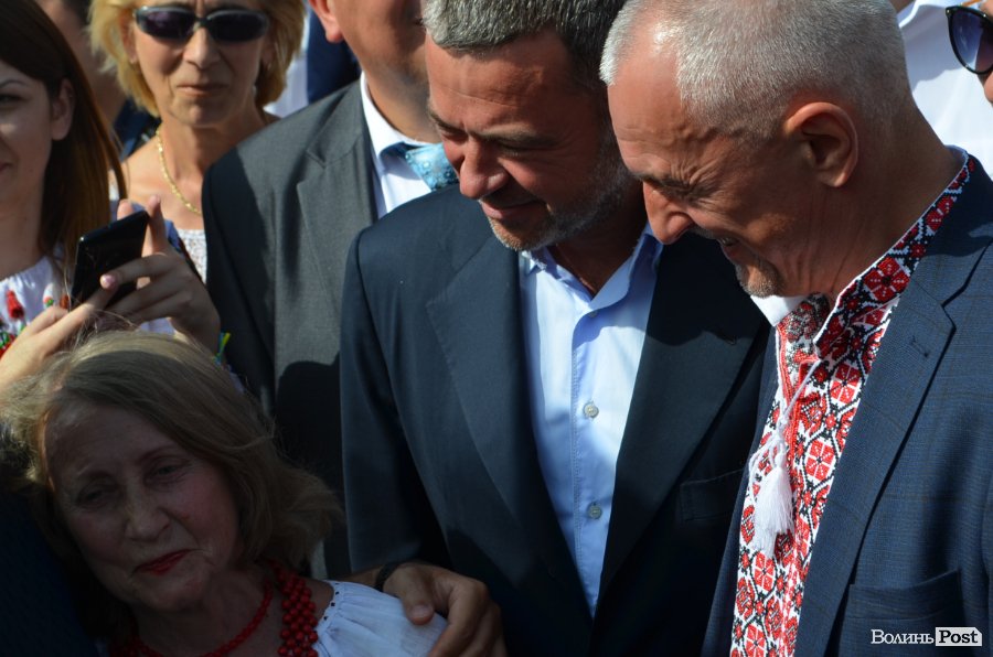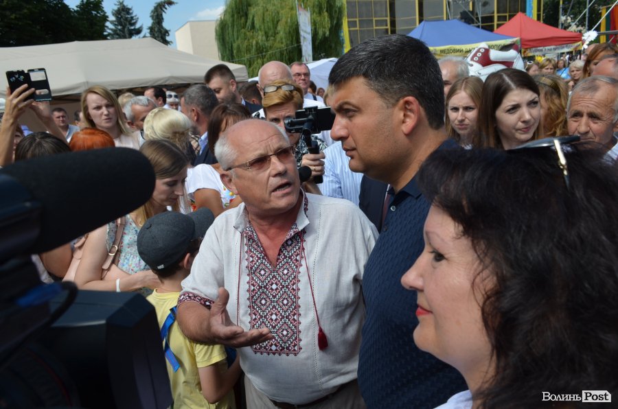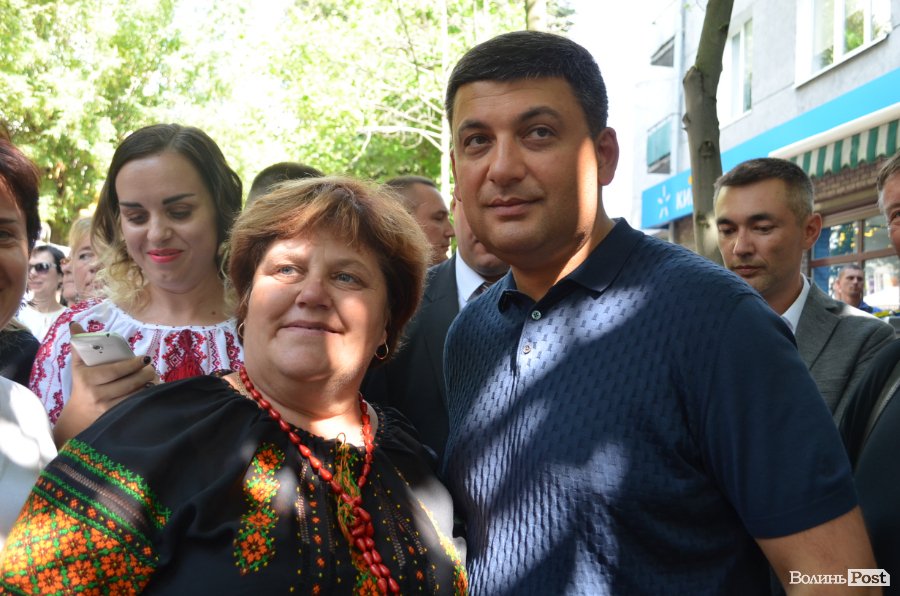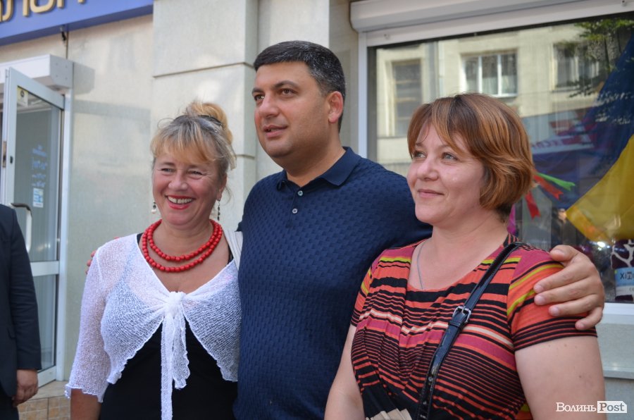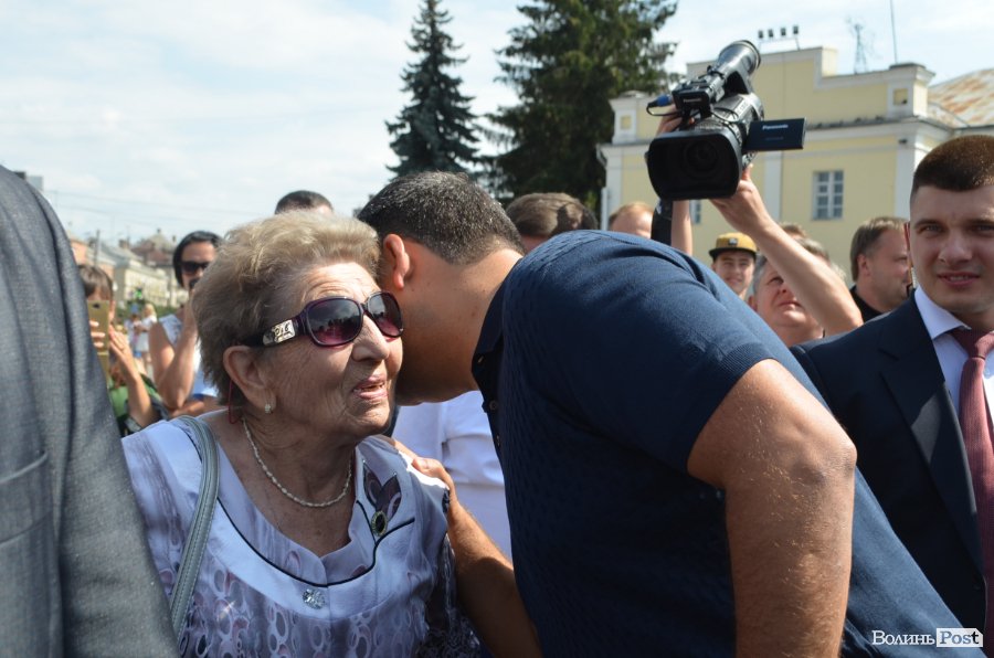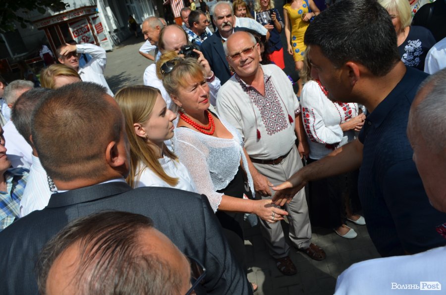 У центрі Театрального майдану посадовця миттєво оточили десятки людей, а на сцені притихло «Поліське літо з фольклором». Чи не найпершою «заселфитися» із прем’єром вдалося місцевій пенсіонерці. Жінка вправно оминула охорону та попросила дозволу сфотографуватися.