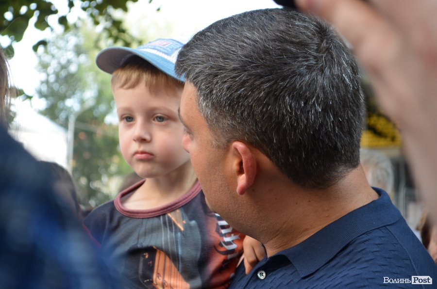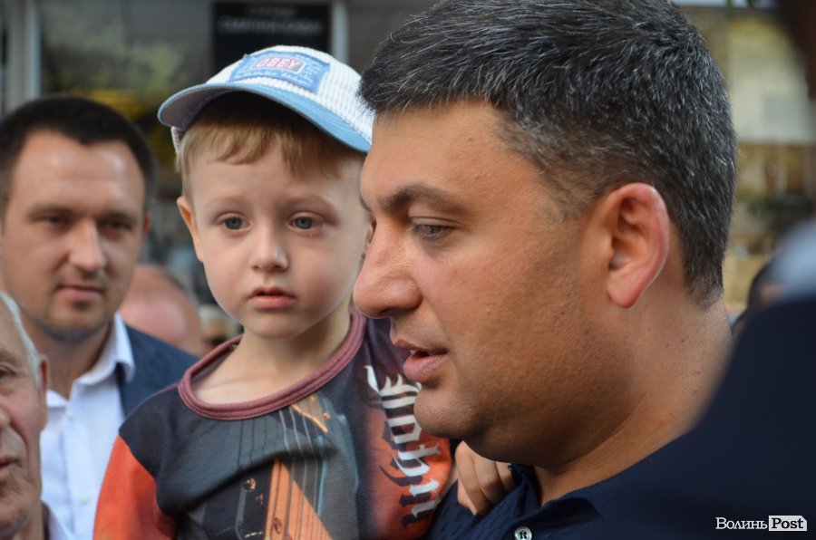 На кілька хвилин посадовець зупинився біля ююної скрипальки, яка вигравала класичну мелодію, та поспілкувався із маленьким лучанином Павлом та його мамою. Аби розмова вийшла приязнішою, Гройсман взяв хлопчика на руки.