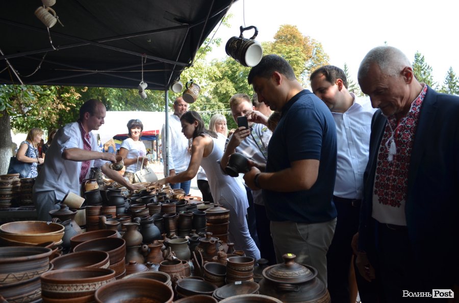 На вулиці Лесі Українки його увагу найперше привернув ярмарок, де продавали вироби із глини. Однак, як слід роздивится асортимент прем’єу не вдалося – його знову обступили охочі зробити селфі. Дехто умудрявся фотографуватися просто на ходу.