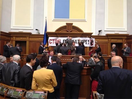 Опозиція знову заблокувала Верховну Раду. ФОТО