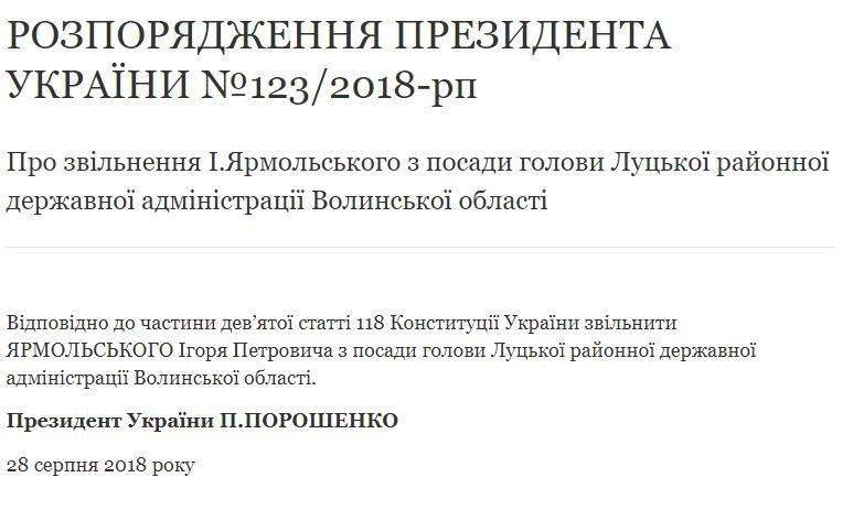 Так, у документі йдеться про звільнення Ярмольського з посади голови Луцької районної державної адміністрації Волинської області.